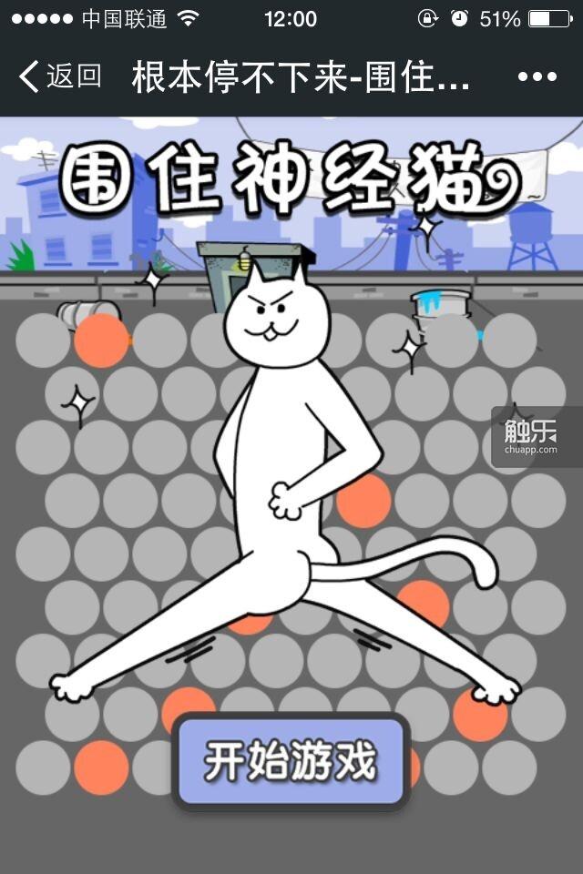 《围住神经猫》大概具备了一个流行小游戏的很多优良特征:上手简单又不失挑战性;醒目位置大大咧咧地显示着网络流行俗语;欠欠的猫形象加贱贱的表情让人忍俊不禁;默认分享模版“我没有围住它,谁能帮个忙”和“我用X步围住神经猫……你能超过我吗”,恰到好处地撩拨起玩家攀比的心态。